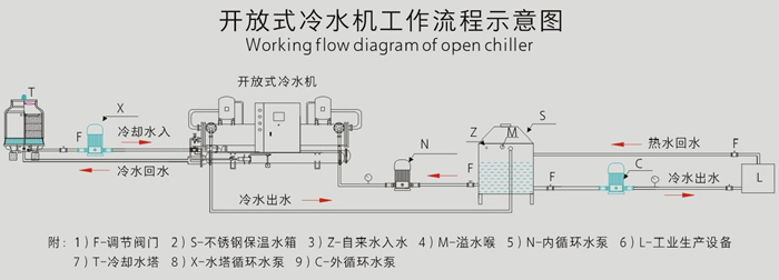 3、開放式冷水機組跟水冷式冷水機組結構運行原理一樣,開放式需要配置一臺循環(huán)儲水箱和外循環(huán)水泵;